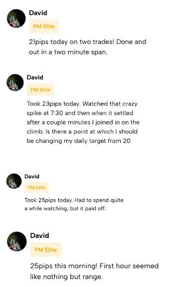 David is getting a little over 20 pips per day (sometimes in 1 hour, sometimes in 2) and is SUPER consistent.